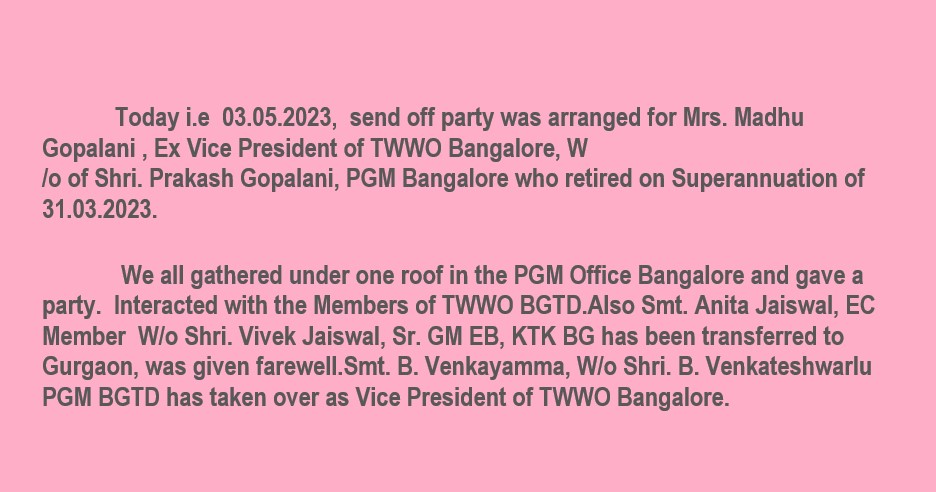 - Retirement of Smt.Parvathi,TWWO member,CO BG
